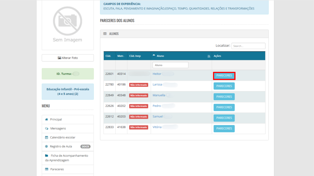 2. Será exibido uma relação com todos os alunos, para registrar um novo parecer, basta clicar no ícone azul indicado na imagem abaixo.