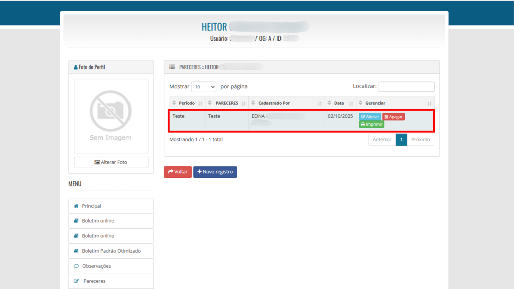 4. Feito o registro, ele será exibido na lista dos pareceres do aluno. Será disponibilizado 3 opções: