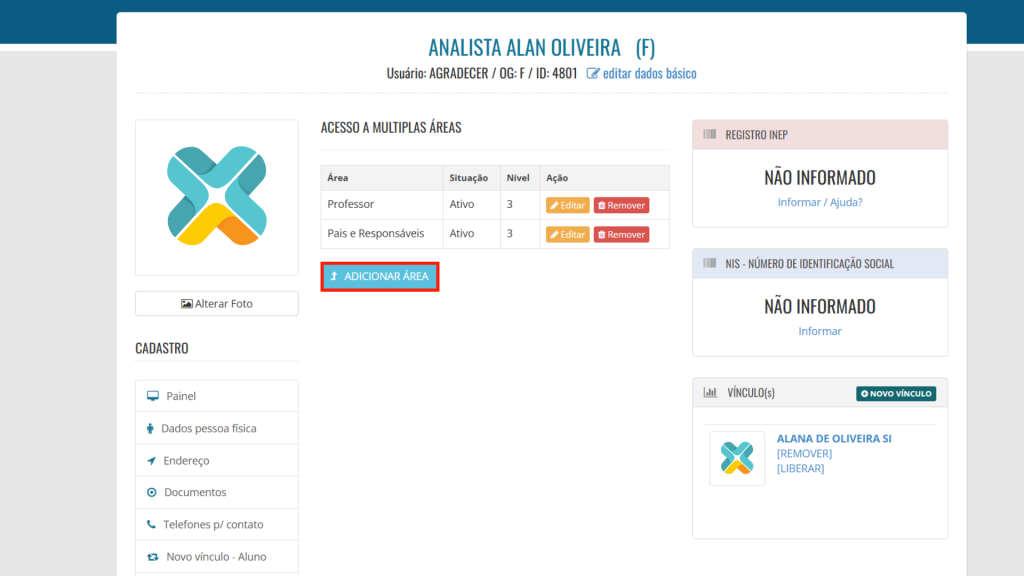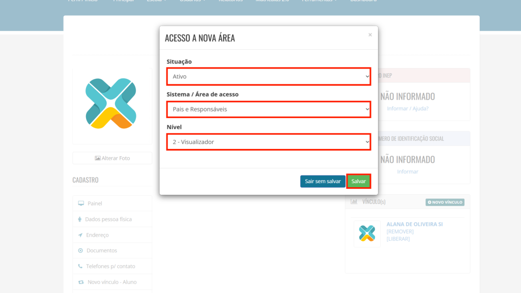 4 – Será disponibilizado alguns campos para preencher como a área de acesso que vai ser oferecida ao usuário bem como o seu nível de acesso. Finalizado o processo, clique em “Salvar”.