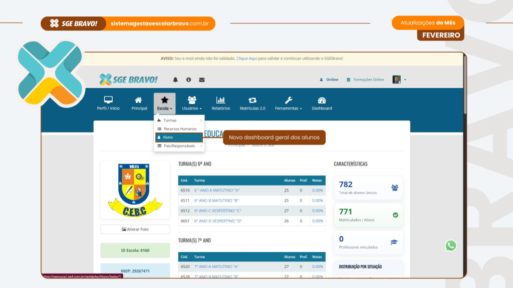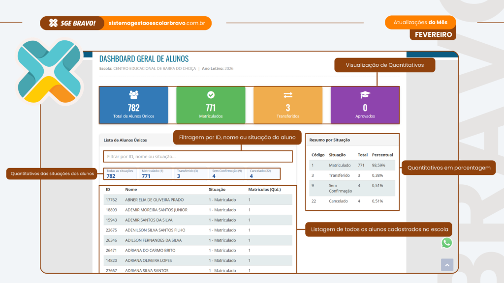 Adicionamos também um novo ambiente acessado pelo menu superior da tela, no ícone “Escola”, ao clicar em “Aluno”. Nesse espaço, é apresentado um dashboard geral com uma visão ampla e estratégica dos dados dos estudantes. O painel reúne indicadores como total de alunos, matriculados, aprovados, transferidos, além das respectivas porcentagens e dos quantitativos por situação.
