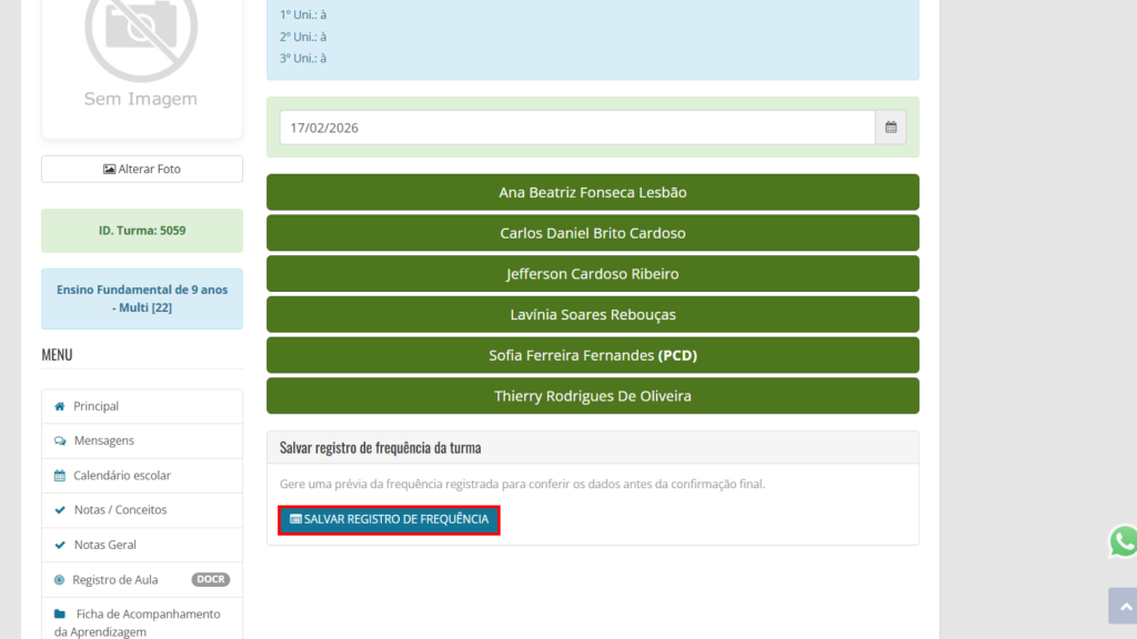 4. Após realizar a frequência, clique em “Salvar Registro de Frequência”