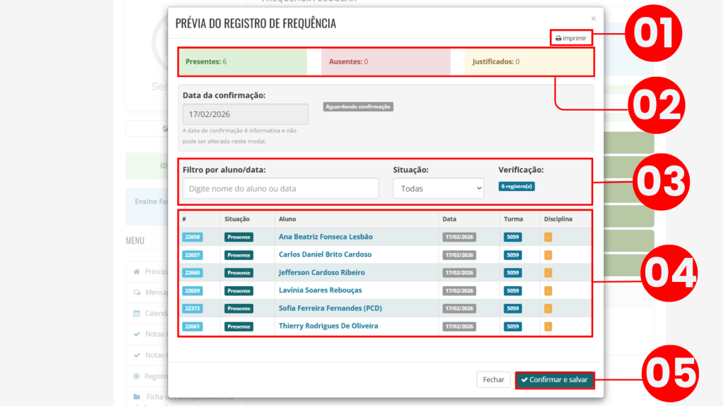 Agora, o registro de frequência conta com uma nova organização visual, prévia para conferência e confirmação obrigatória dos dados, fortalecendo a confiabilidade das informações lançadas.
